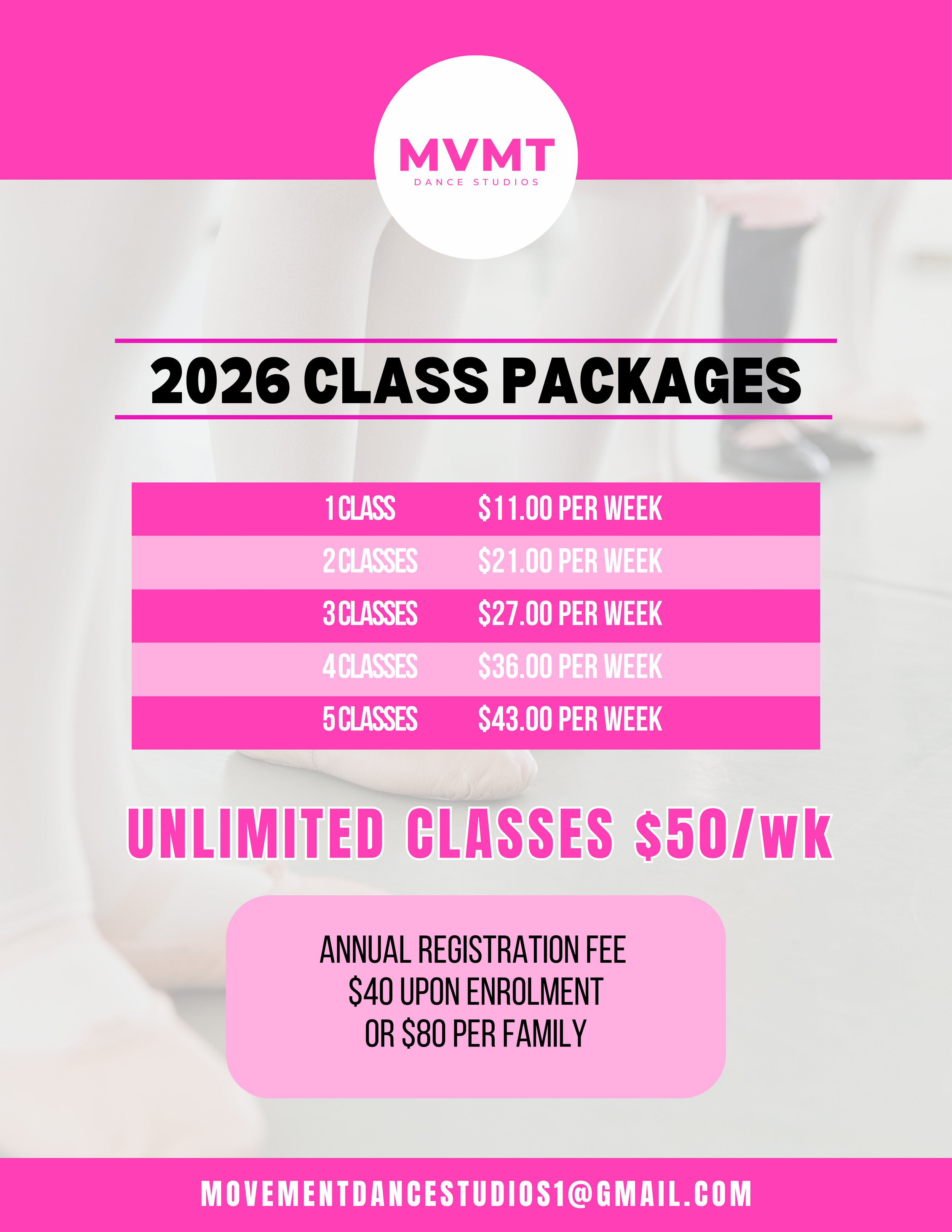 Students can train in a variety of styles, including Ballet, Jazz, Tap, Acro, Hip Hop, and Contemporary. Each class is age appropriate and focuses on proper technique, coordination, musicality, strength, and flexibility, all while keeping learning fun and engaging.